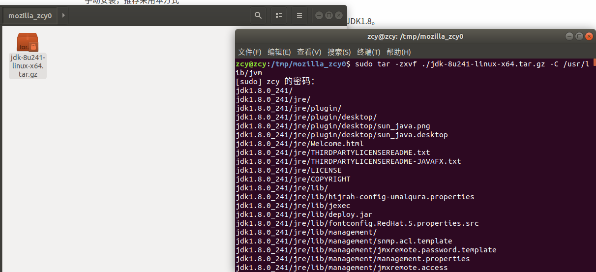 sudo tar -zxvf ./jdk-8u241-linux-x64.tar.gz -C /usr/lib/jvm #把JDK文件解压到/usr/lib/jvm目录下