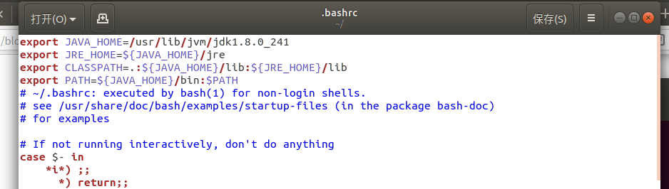 export JAVA_HOME=/usr/lib/jvm/jdk1.8.0_241 export JRE_HOME=${JAVA_HOME}/jre export CLASSPATH=.:${JAVA_HOME}/lib:${JRE_HOME}/lib export PATH=${JAVA_HOME}/bin:$PATH