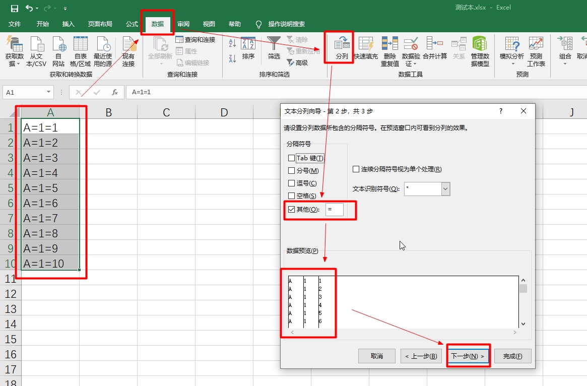 操作描述:选中要拆分的数据--数据--分列--其他(填写=)--查看数据预览--完成
