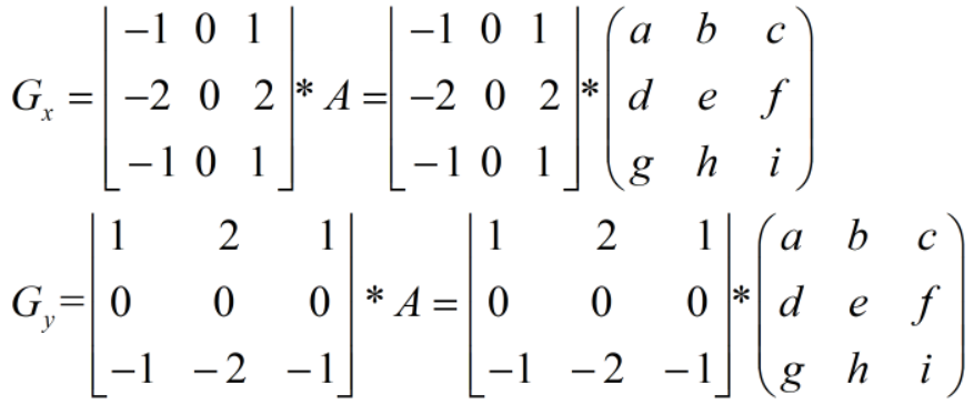 G x = ⌊ − 1 0 1 − 2 0 2 − 1 0 1 ⌋ G y = ⌊ 1 2 1 0 0 0 − 1 − 2 − 1 ⌋ {G_x} = leftlfloor begin{array}{l} - 1{kern 1pt} {kern 1pt} {kern 1pt} {kern 1pt} {kern 1pt} {kern 1pt} {kern 1pt} {kern 1pt} 0{kern 1pt} {kern 1pt} {kern 1pt} {kern 1pt} {kern 1pt} {kern 1pt} {kern 1pt} {kern 1pt} {kern 1pt} 1\- 2{kern 1pt} {kern 1pt} {kern 1pt} {kern 1pt} {kern 1pt} {kern 1pt} {kern 1pt} {kern 1pt} 0{kern 1pt} {kern 1pt} {kern 1pt} {kern 1pt} {kern 1pt} {kern 1pt} {kern 1pt} {kern 1pt} {kern 1pt} {kern 1pt} 2\ {kern 1pt} - 1{kern 1pt} {kern 1pt} {kern 1pt} {kern 1pt} {kern 1pt} {kern 1pt} 0{kern 1pt} {kern 1pt} {kern 1pt} {kern 1pt} {kern 1pt} {kern 1pt} {kern 1pt} {kern 1pt} {kern 1pt} {kern 1pt} 1 end{array} rightrfloor {kern 1pt} {kern 1pt} {kern 1pt} {kern 1pt} {kern 1pt} {kern 1pt} {kern 1pt} {kern 1pt} {kern 1pt} {kern 1pt} {kern 1pt} {G_y}{rm{ = }}leftlfloor begin{array}{l} 1{kern 1pt} {kern 1pt} {kern 1pt} {kern 1pt} {kern 1pt} {kern 1pt} {kern 1pt} {kern 1pt} {kern 1pt} {kern 1pt} {kern 1pt} {kern 1pt} {kern 1pt} {kern 1pt} {kern 1pt} {kern 1pt} {kern 1pt} {kern 1pt} {kern 1pt} {kern 1pt} {kern 1pt} {kern 1pt} {kern 1pt} {kern 1pt} {kern 1pt} {kern 1pt} 2{kern 1pt} {kern 1pt} {kern 1pt} {kern 1pt} {kern 1pt} {kern 1pt} {kern 1pt} {kern 1pt} {kern 1pt} {kern 1pt} {kern 1pt} {kern 1pt} {kern 1pt} {kern 1pt} {kern 1pt} {kern 1pt} {kern 1pt} {kern 1pt} {kern 1pt} {kern 1pt} {kern 1pt} {kern 1pt} {rm{1}}\ 0{kern 1pt} {kern 1pt} {kern 1pt} {kern 1pt} {kern 1pt} {kern 1pt} {kern 1pt} {kern 1pt} {kern 1pt} {kern 1pt} {kern 1pt} {kern 1pt} {kern 1pt} {kern 1pt} {kern 1pt} {kern 1pt} {kern 1pt} {kern 1pt} {kern 1pt} {kern 1pt} {kern 1pt} {kern 1pt} {kern 1pt} {rm{0}}{kern 1pt} {kern 1pt} {kern 1pt} {kern 1pt} {kern 1pt} {kern 1pt} {kern 1pt} {kern 1pt} {kern 1pt} {kern 1pt} {kern 1pt} {kern 1pt} {kern 1pt} {kern 1pt} {kern 1pt} {kern 1pt} {kern 1pt} {kern 1pt} {kern 1pt} {kern 1pt} {kern 1pt} {rm{0}}\ - 1{kern 1pt} {kern 1pt} {kern 1pt} {kern 1pt} {kern 1pt} {kern 1pt} {kern 1pt} {kern 1pt} {kern 1pt} {kern 1pt} {kern 1pt} - 2{kern 1pt} {kern 1pt} {kern 1pt} {kern 1pt} {kern 1pt} {kern 1pt} {kern 1pt} {kern 1pt} {kern 1pt} {kern 1pt} {kern 1pt} - 1 end{array} rightrfloor {kern 1pt} {kern 1pt} Gx=⎣⎢⎢⎢−101−202−101⎦⎥⎥⎥Gy=⎣⎢⎢⎢121000−1−2−1⎦⎥⎥⎥