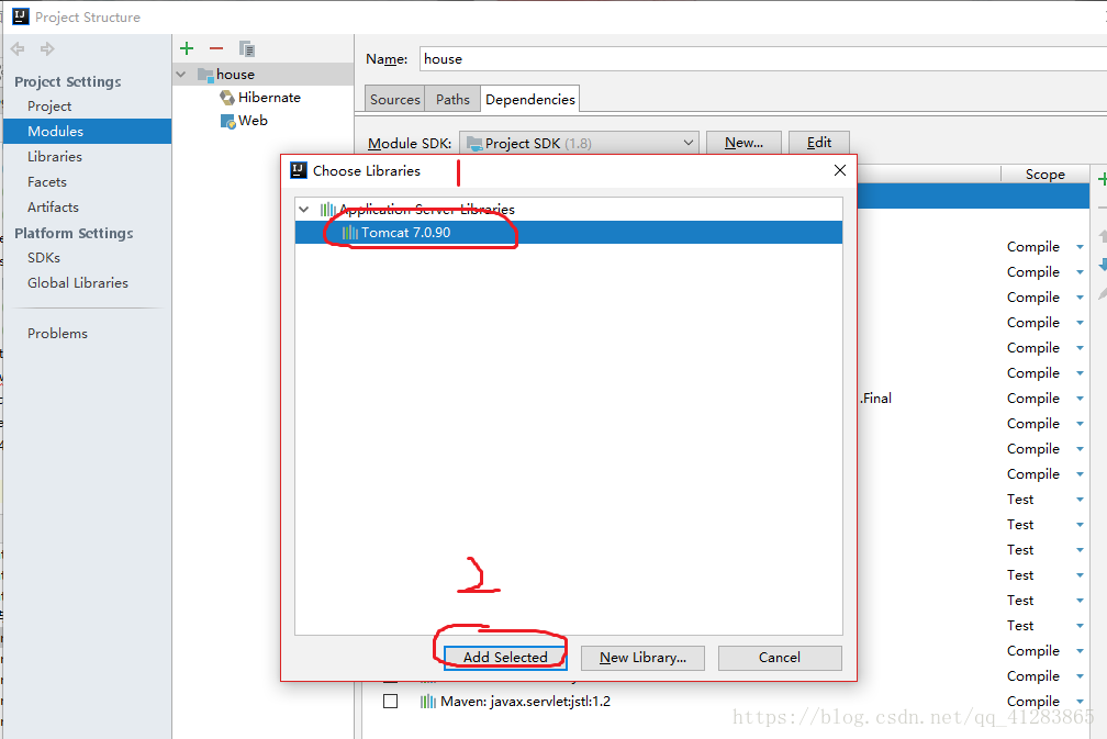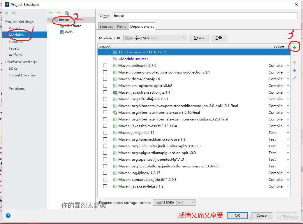 3.选择Modules这个选项,再选择到你的项目中,点击绿色的“+”号