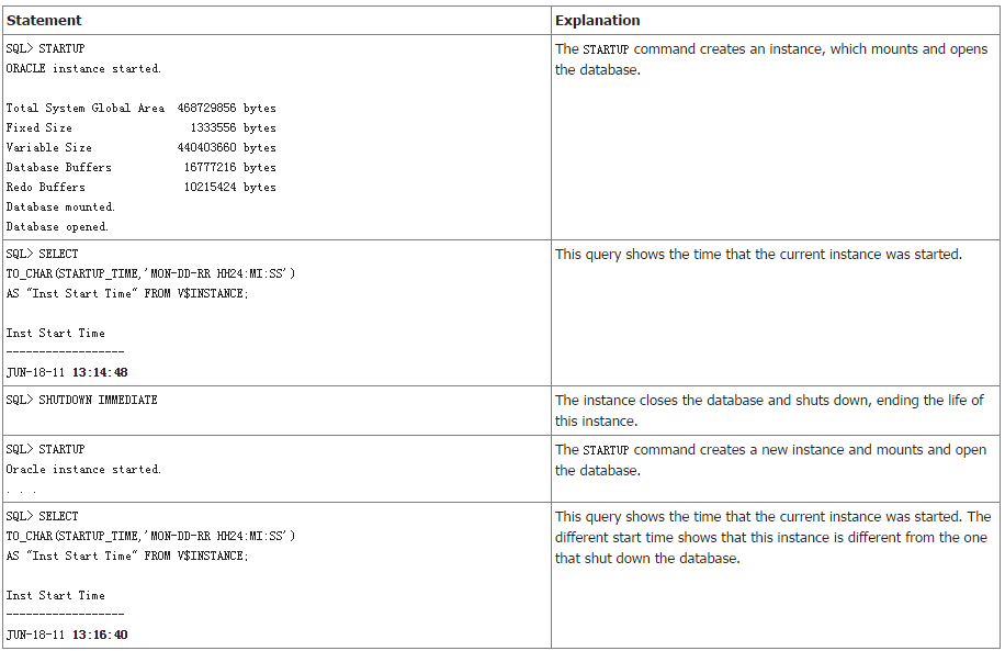 一个实例由STARTUP命令开始,被终止时结束。在这个过程中,一个实例只能跟一个数据库关联。而且,一个实例只能挂载一次数据库,只能关闭一次数据库,只能打开一次数据库。一个数据库关闭后,你必须启动一个不同的实例去挂载、打开这个数据库。