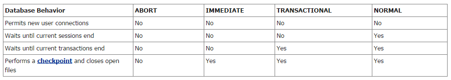 这种模式阻止用户开始新的事务,但关闭前会等待当前事务完成。根据当前事务的特性这种模式可能会花费很长时间。