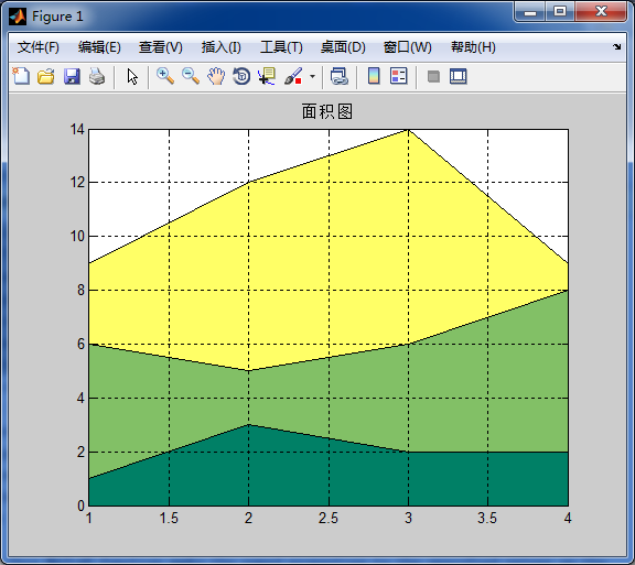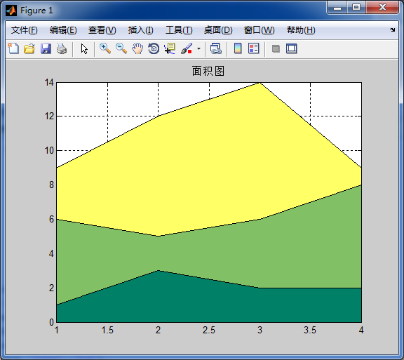 面积图在实际中可以表现不同部分对整体的影响,在MATLAB中,绘制面积图的命令是area,它的使用格式如下: