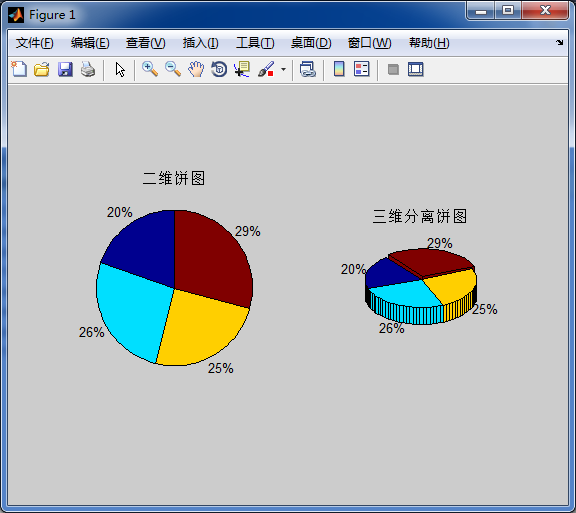 pie(X, explode) 从饼形图中分离出一部分。explode为一与X同维的矩阵。当所有元素为零时,饼图的各个部分将连在一起组成一个