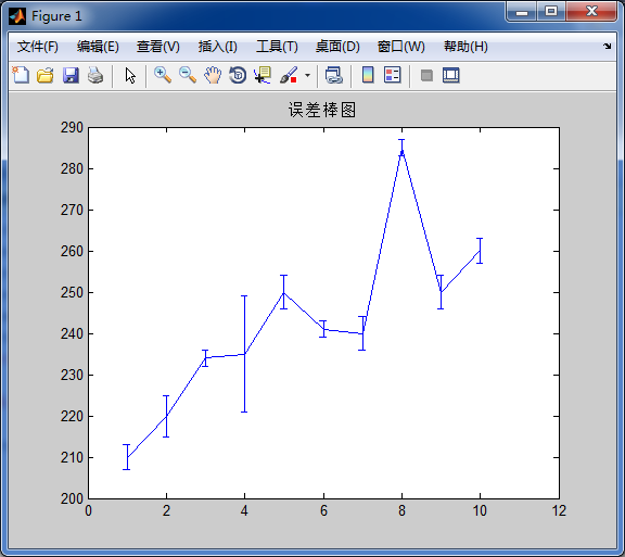 errorbar(Y,E) 画出向量Y,同时显示在向量Y的每一元素之上的误差棒,其中误差棒为E(i)在曲线y上面与下面的距离线段,