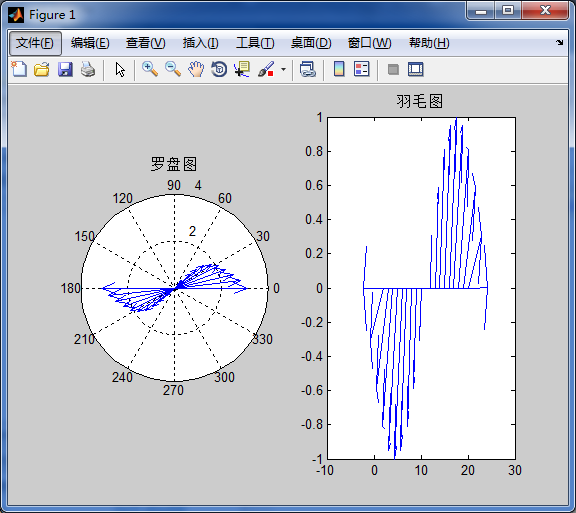 羽毛图是在横坐标上等距地显示向量的图形,看起来就像鸟的羽毛一样。它的绘制命令是feather,该命令的使用格式如下: