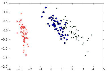 降维的数据如上图所示。每个数据集中三个类都用不同的符号标记。从这个二维数据图中可以明显看