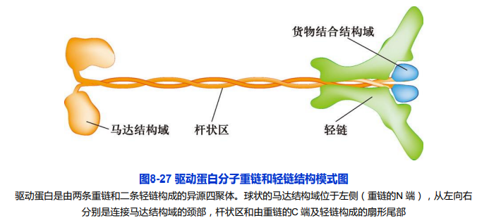 马达结构域与微丝或微管结合;货物结合结构域与膜性细胞器或大分子复合物特异性结合;
