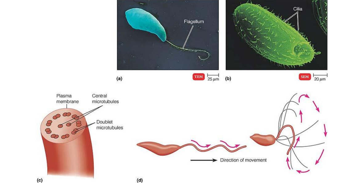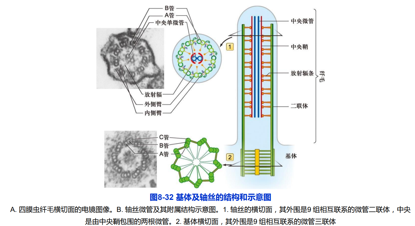 纤毛(cilia)和鞭毛(flagella)是突出于细胞表面的、高度特化的细胞结构。