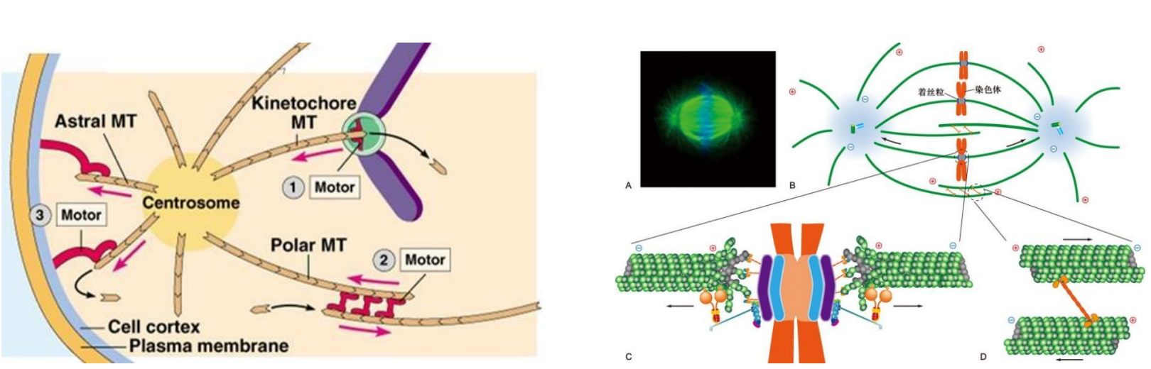- M-驱动蛋白:马达结构域位于多肽链中部,结合在MT正极或负极端,使微管处于不稳定状态;