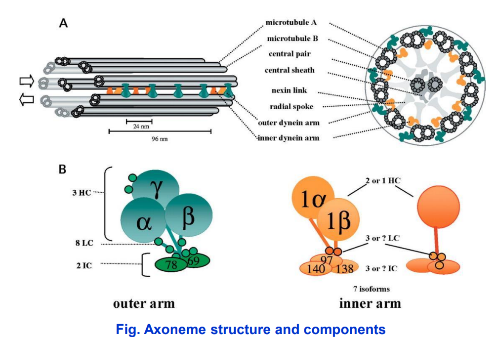 • 内侧动力蛋白臂(inner dynein arms)和外侧动力蛋白臂(outer dynein arms)