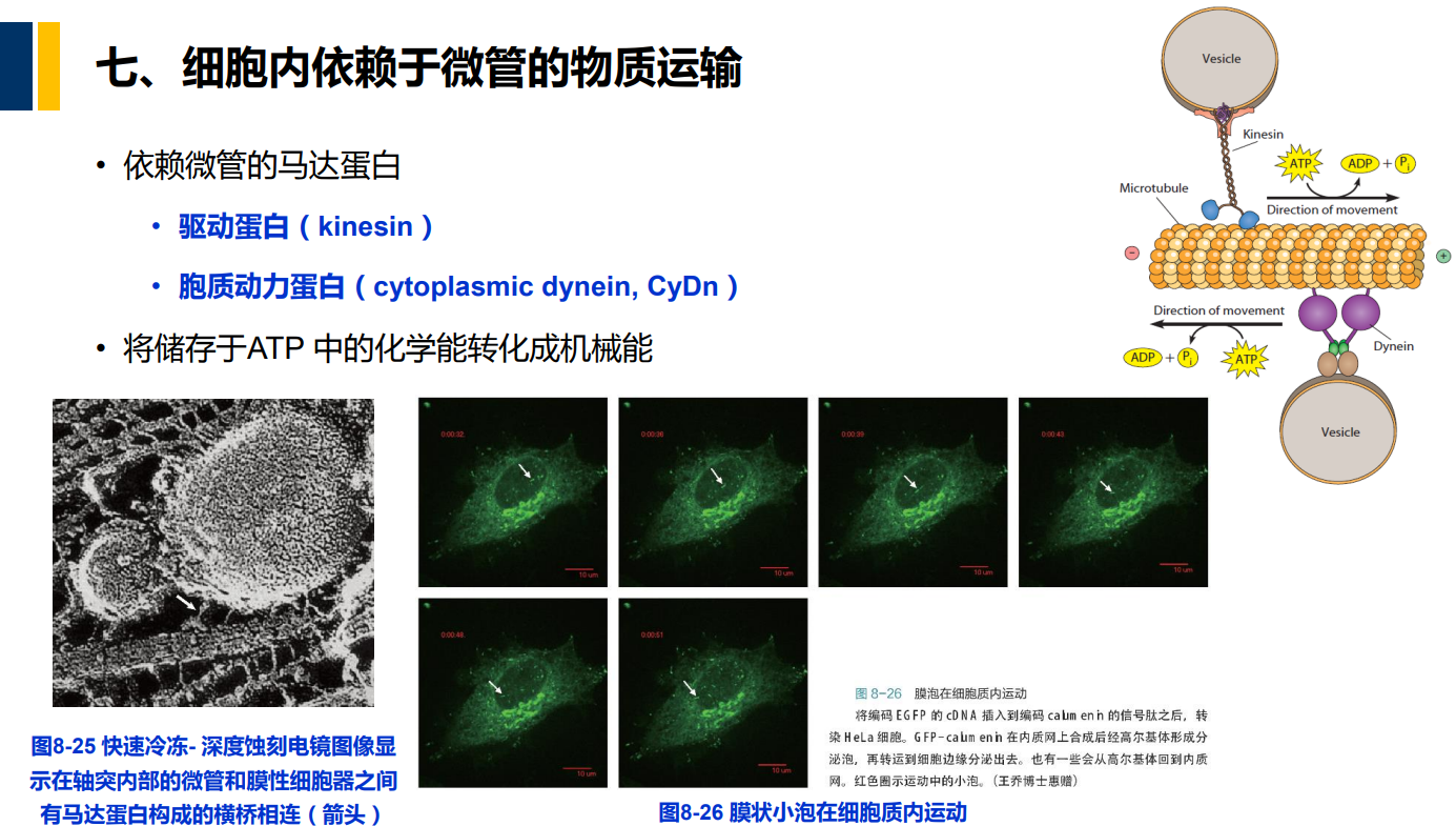 - 驱动蛋白的马达结构域上两个重要功能位点:ATP结合位点和微管结合位点;