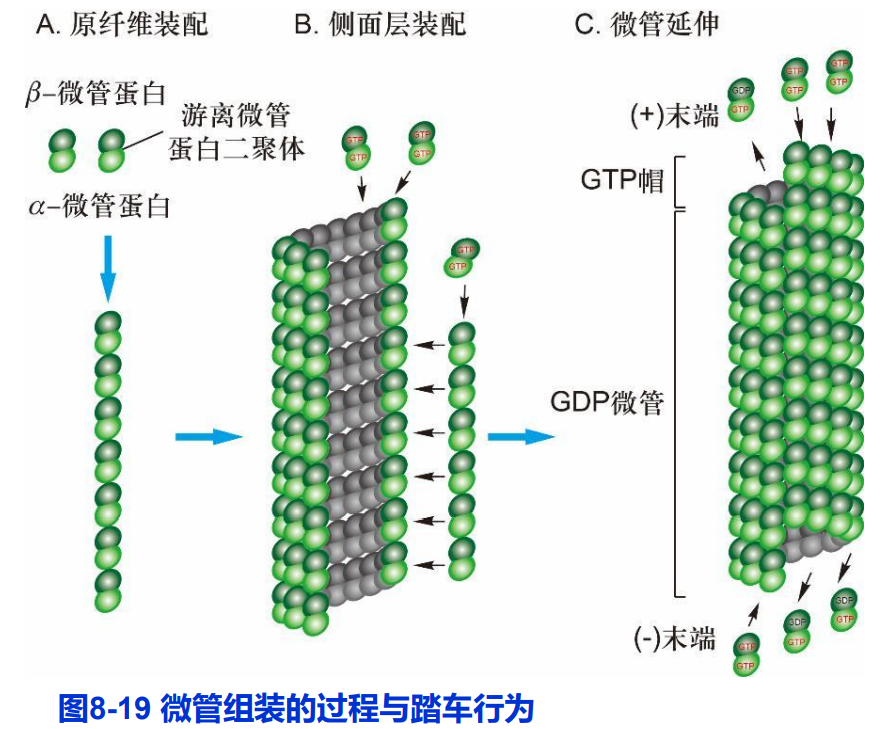 α/β-微管蛋白首先组装成原纤丝;原纤丝侧向相互作用形成片层;由13根原纤丝合拢形成的微管,α/β-微管蛋白从两端加入(或解聚)使微管延长(或缩短)。当体系中α/β-微管蛋白的浓度处于临界浓度时,微管蛋白在微管的正极端组装的速度与负极端去组装的速度相等,微管的长度可以保持不变。