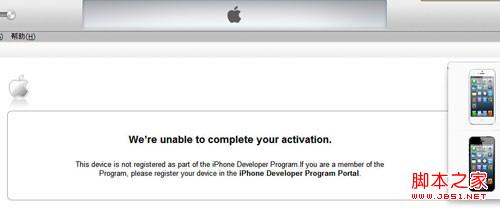 三、好吧,假如你手贱点击了上面的选项,你的设备无法激活了,iTunes将显示这个设备没有通过开发者账号激活,如下图,死不死活不活的,是不是有种崩溃的感觉。这个时候千万别急躁,静下心按照下面的方式抢救。