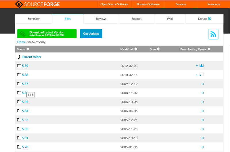1) 访问网址 https://sourceforge.net/projects/ntwox/,进入 netwox 下载页面,如图所示。图中显示了可下载的版本,从这里可以看到当前的最新版本为 5.39。