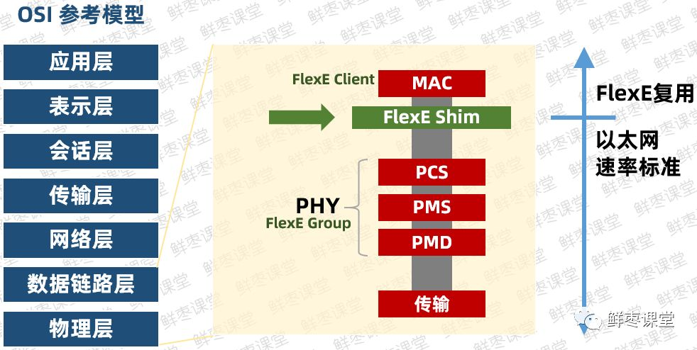 它在传统以太网架构的基础上,引入了全新的FlexE Shim层,实现MAC(介质访问控制子层,属于数据链路层)和PHY(物理层)的解耦。