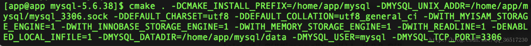 cmake . -DCMAKE_INSTALL_PREFIX=/home/app/mysql -DMYSQL_UNIX_ADDR=/home/app/mysql/mysql_3306.sock -DDEFAULT_CHARSET=utf8 -DDEFAULT_COLLATION=utf8_general_ci -DWITH_MYISAM_STORAGE_ENGINE=1 -DWITH_INNOBASE_STORAGE_ENGINE=1 -DWITH_MEMORY_STORAGE_ENGINE=1 -DWITH_READLINE=1 -DENABLED_LOCAL_INFILE=1 -DMYSQL_DATADIR=/home/app/mysql/data -DMYSQL_USER=mysql -DMYSQL_TCP_PORT=3306