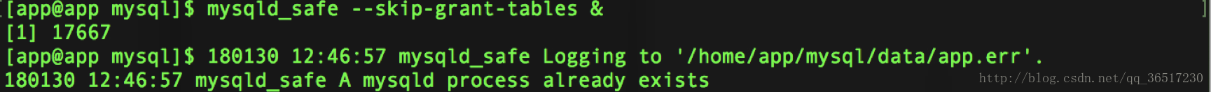17.进入mysql安全模式(mysqld_safe --skip-grant-tables &)(如果这里报错,输入ps -ef|grep mysqld,查看mysql的进程,杀死进程。继续输入mysqld_safe --skip-grant-tables & 进入安全模式)