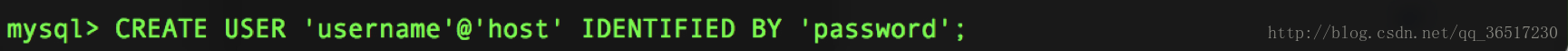 19.创建用户 CREATE USER'username'@'host' IDENTIFIED BY 'password';(其中usermame为创建的用户名,host为本地’localhost’或者允许远程连接”%”,password为当前用户的密码)