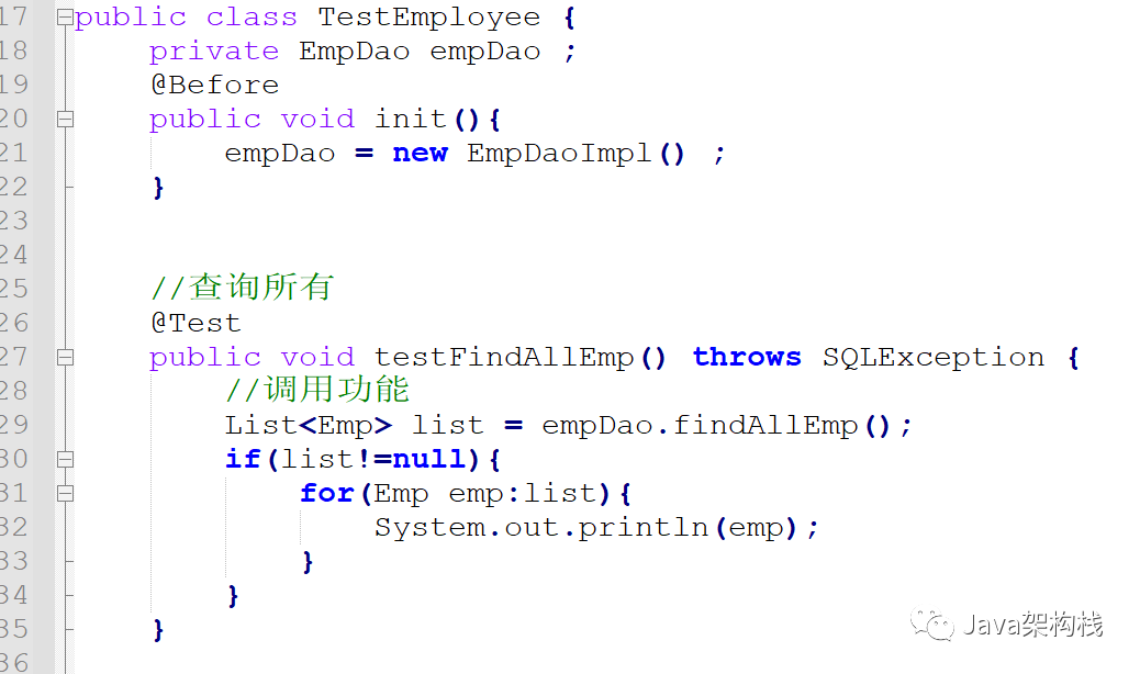 在下面的代码中,我们会通过JDBC的方式,将数据库表中的所有员工信息查询并封装到List集合中,并使用单元测试来测试接口功能。代码如下: