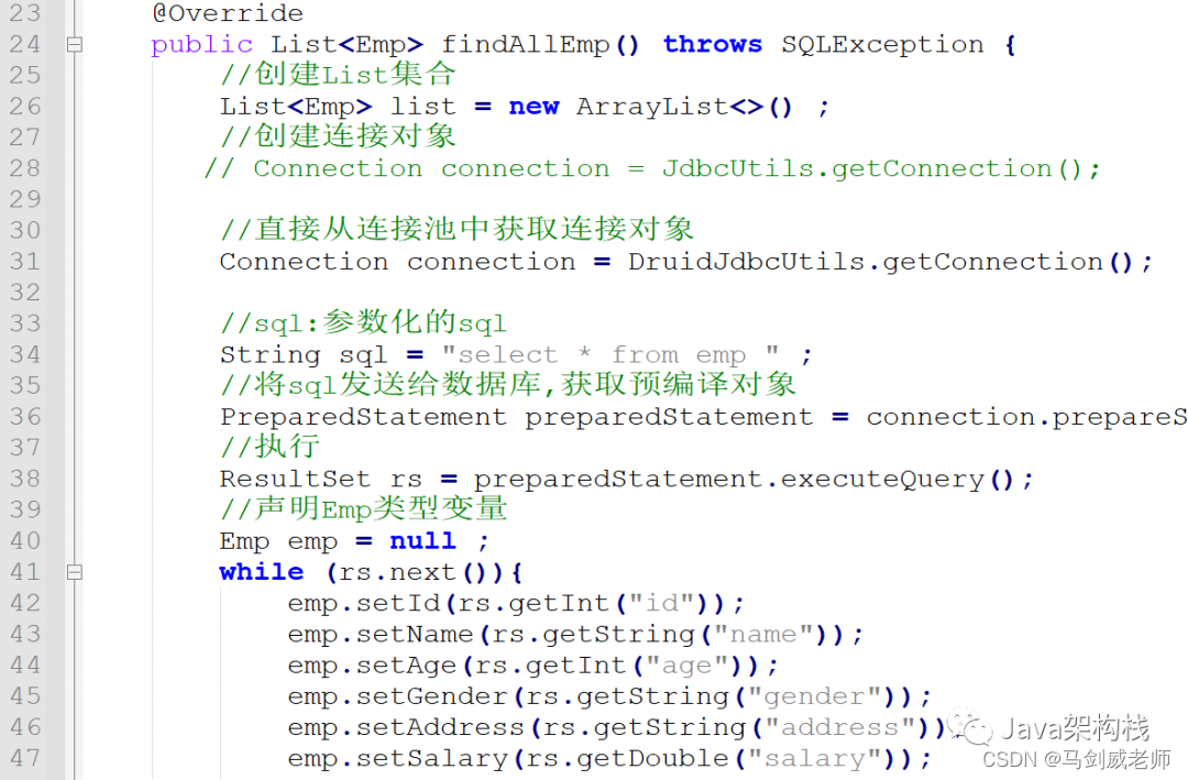 该方法的逻辑是要将查询到的多条记录都封装到List集合中,而List集合里添加的是员工对象,我们上面代码的错误提示的就是出现在这个方法中的第42行!而42行刚好就是我们从数据库中得到每一行每一列的字段信息。