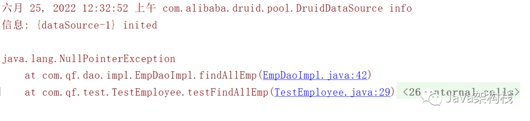 上面的代码执行之后,我们会在控制台的异常信息中发现,在第29行码"com.qf.test.TestEmployee.testFindAllEmp(TestEmployee.java:29)"中出现了空指针问题。如果我们仔细观察,会发现第29行代码,又在调用第42行代码:"com.qf.dao.impl.EmpDaoImpl.findAllEmp(EmpDaoImpl.java:42)"。我们继续阅读第42行代码,如下图所示: