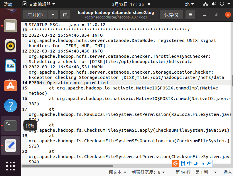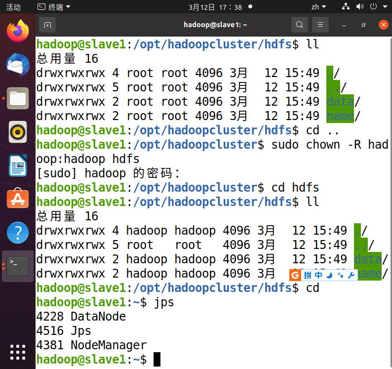 然后就去查看了这个文件的权限,然后看到这个文件的所有者是root用户,而我启动hadoop集群的用户为hadoop,所以就把这个文件的所有者改为hadoop并重启hadoop集群,然后两个从节点的datanode就出现了,问题成功解决
