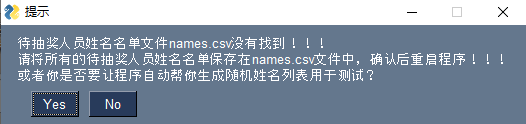 如果说你只是想拿来玩玩儿,你没有这个names.csv文件 。此时,请点击上图中的Yes按钮,那么系统会给出一个提示(如图所示),自动为你生成若干姓名,用于抽奖。