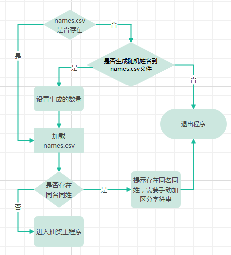 提示中提到了一个names.csv文件 ,这就是你公司员工的姓名信息数据。你需要将这个程序和names.csv文件,放在同一工作部录下。之后,整个程序就是基于该文件中的数据,完成抽奖这个过程的。