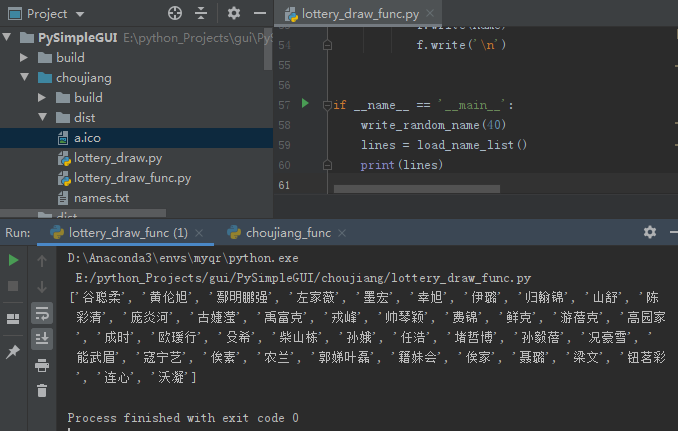 首先我们开发一些基本的函数,用于随机姓名的生成,姓名文件的加载等。创建本地文件lottery_draw_func.py,部分代码如下: