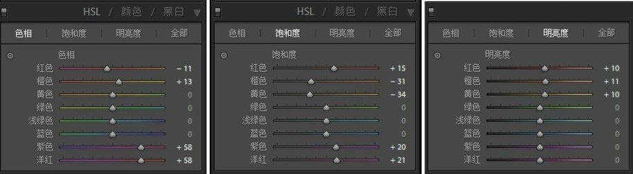 3、经过上面两步的调整,片子整体得到了不不错的改善,但是部分色彩过于饱和。接下来我们到HSL面板中去解决这个问题。让整体的色调更加自然。