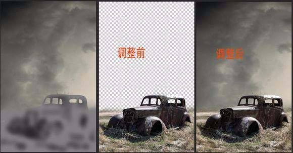 5、根据自己的理解,可适当地对背景进行模糊处理。继续处理车子及杂草的明暗关系。为汽车图层新建一剪贴蒙版图层,填充为50%中度灰,混合模式为叠加。在需要调暗的部分用黑色画笔(将画笔的不透明度及流量设置为30——40之间)涂抹,需要调亮的部位用白色画笔涂抹。结果如下图所示: