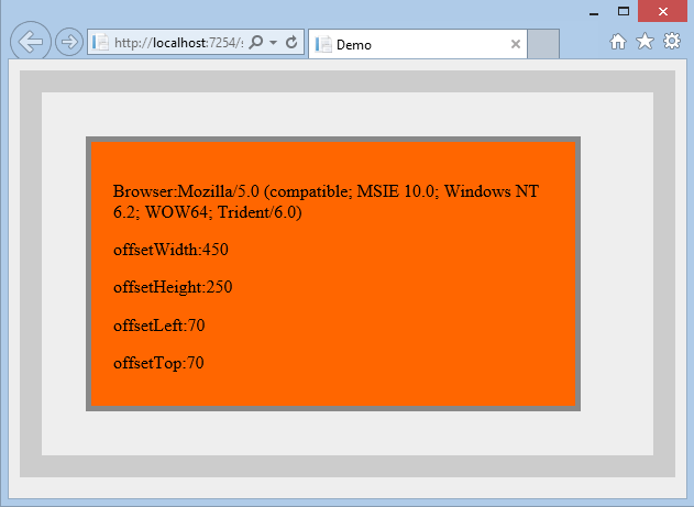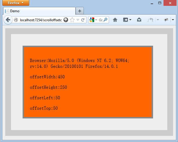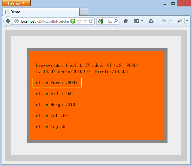 <!DOCTYPE html> <html> <head> <title>Demo</title> </head> <body> <style type="text/css"> body { margin:0; padding:0; background:#EEE; } div,ul,li { margin:0; } li { height:20px; line-height:20px; } #test { width:400px; height:250px; padding:20px; background:#F60; border:10px solid #888; } #divtest { margin:30px; position:relative; left:50px; top:70px; padding:20px; } </style> <div id="divtest"> <ul> <li>Test</li> <li>Test</li> </ul> <div id="test"> </div> </div> <script> var test = document.getElementById("test"); test.innerHTML = "<p>Browser:" + navigator.userAgent + "</p>" + "<p>offsetParent:" + test.offsetParent.tagName + "</p>" + "<p>offsetWidth:" + test.offsetWidth + "</p>" + "<p>offsetHeight:"+test.offsetHeight+"</p>"+ "<p>offsetLeft:"+test.offsetLeft+"</p>"+ "<p>offsetTop:"+test.offsetTop+"</p>"; </script> </body> </html>