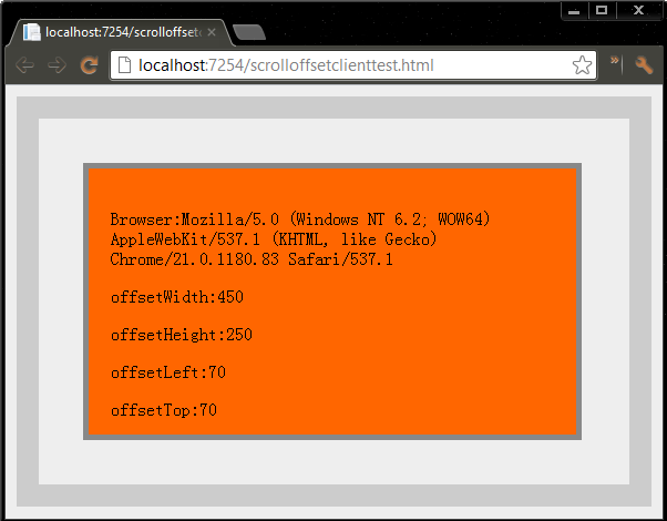 <body> <style type="text/css"> body { border:20px solid #CCC; margin:10px; padding:40px; background:#EEE; } #test { width:400px; height:200px; padding:20px; background:#F60; border:5px solid #888; } </style> <div id="test"></div> <script> var test = document.getElementById("test"); test.innerHTML = "<p>Browser:" + navigator.userAgent + "</p>" + "<p>offsetWidth:" + test.offsetWidth + "</p>" + "<p>offsetHeight:"+test.offsetHeight+"</p>"+ "<p>offsetLeft:"+test.offsetLeft+"</p>"+ "<p>offsetTop:"+test.offsetTop+"</p>"; </script> </body>
