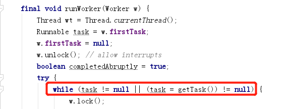 工作线程启动后,就进入runWorker(Worker w)方法。