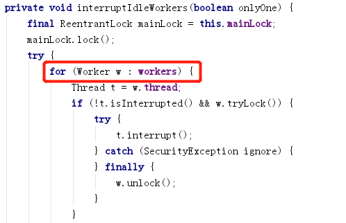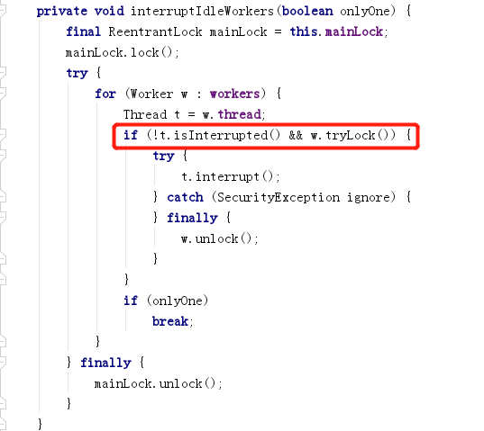 假设A能走到这里,说明A已经从工作线程的集合workers里面移除了(processWorkerExit(Worker w, boolean completedAbruptly) 在tryTerminate()之前,已经将其移除)。那么A中断B,B来到这里中断,就不会在workers里面找到A了。