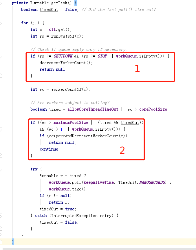 step3. 来到条件2的判断,这时任务队列为空,条件成立,CAS减少线程数,若成功,返回null,否则,重复step1。