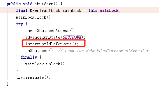 在调用shutdown()之后,会向所有的空闲工作线程发送中断信号。