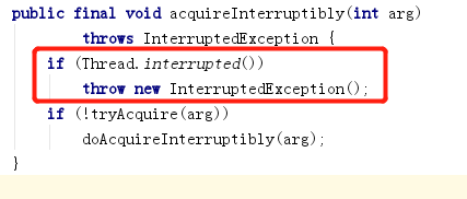 这就要看workQueue的实现了。workQueue是BlockingQueue类型,以常见的LinkedBlockingQueue和ArrayBlockingQueue为例,加锁时都是调用lockInterruptibly(),是响应中断的。该方法又调用了AQS的acquireInterruptibly(int arg)。
