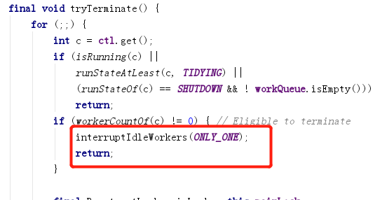 很简单,中断信号将其唤醒,从而进入下一轮循环。到达条件1处,符合条件,减少工作线程数量,并返回null,由外层结束这条线程。