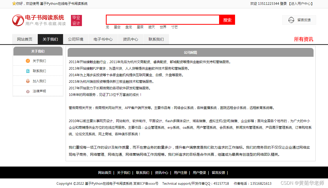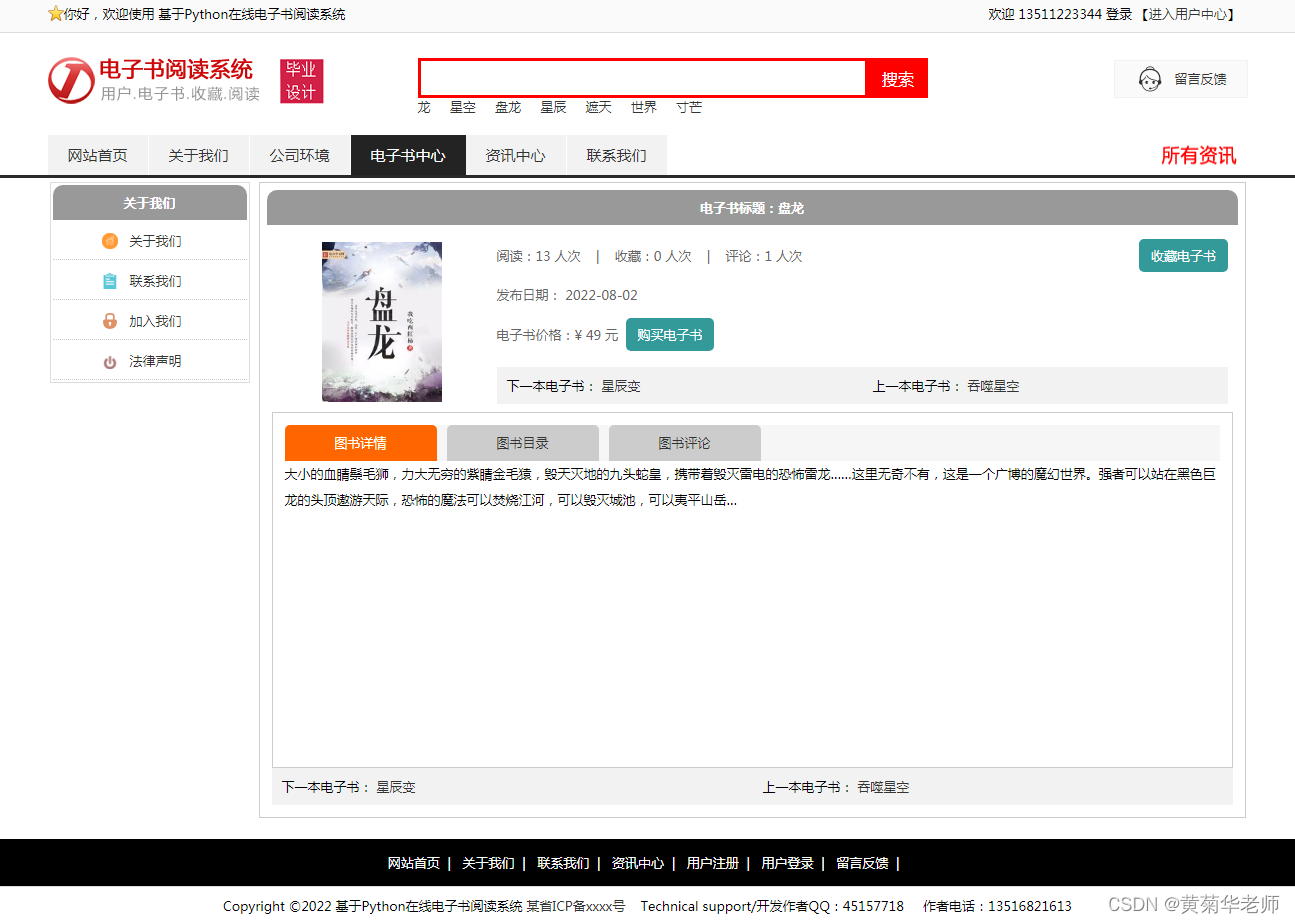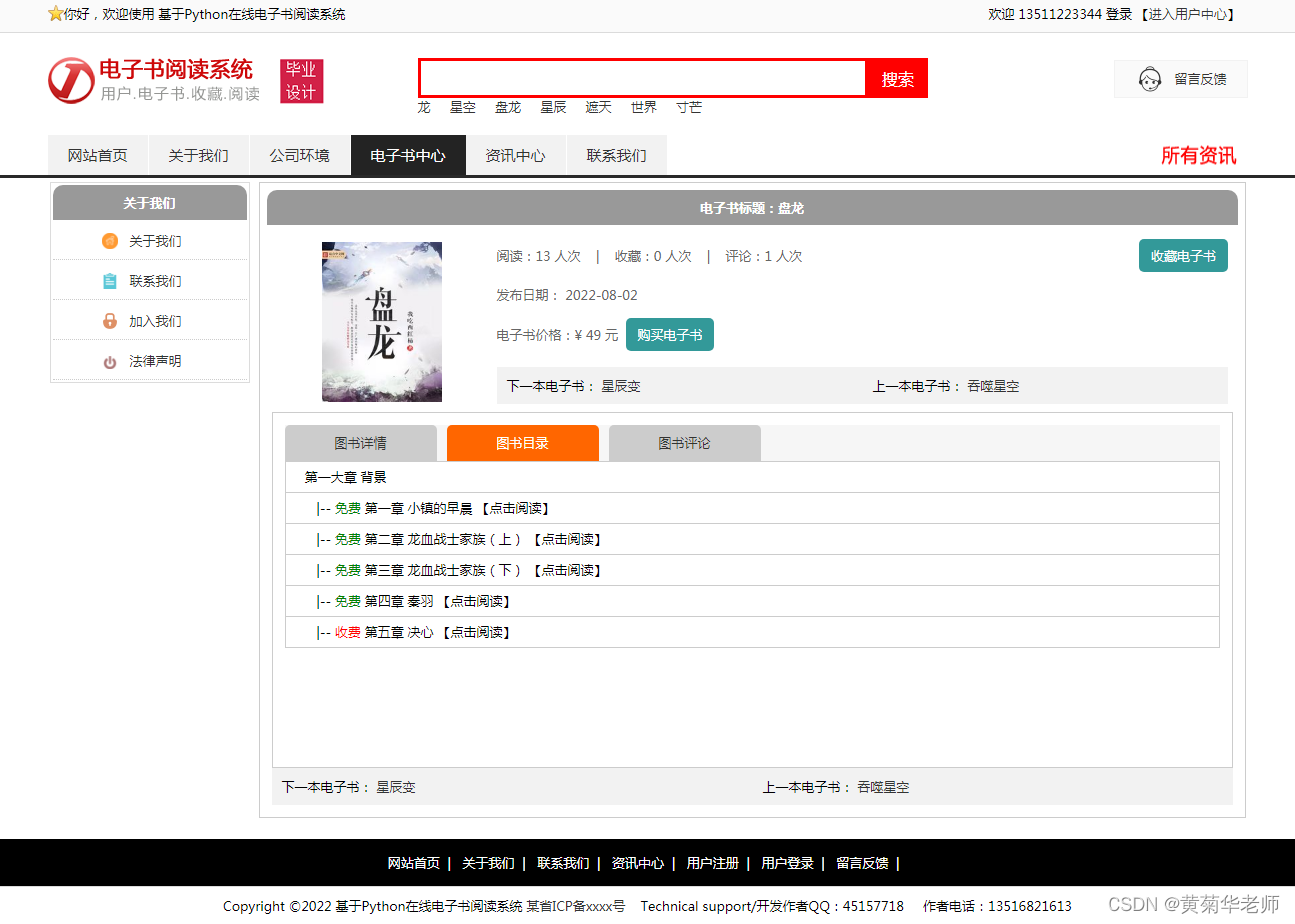 本课题主要目标是设计并能够实现一个基于web网页的电子书阅读系统,整个网站项目使用了B/S架构,基于python的Django框架下开发;管理员通过后台录入信息、管理信息,设置网站信息,管理会员信息,管理和设置广告、留言、录入电子图书等;用户通过登录网站,查询查看新闻资讯、发表评论、查看电子书目录、收藏电子书、购买电子书、发表评论、阅读电子书等。