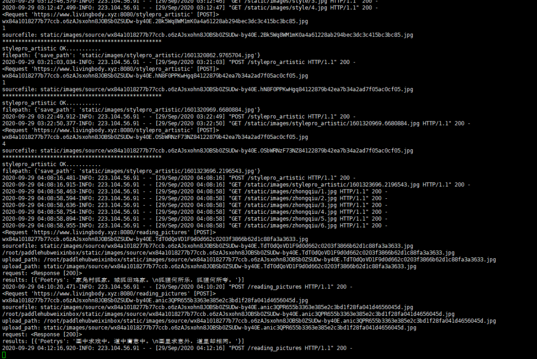 Web后台的作用一是提供看图写诗图片上传、处理,生成的诗返回;二是提供风格画图片上传、风格选择、处理,生成风格画文件路径返回。
