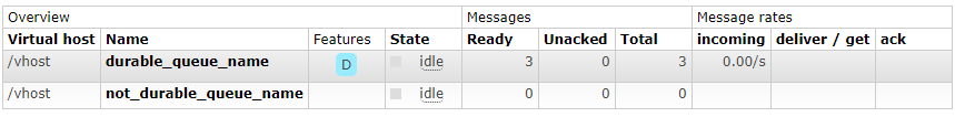 通过控制台,可见只剩下一个持久化的队列durable_queue_name,并且队列里面的消息还存在,另外一个not_durable_queue_name已经丢失,说明在该队列上的消息也已经丢失。
