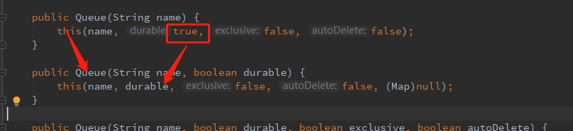 - 我们使用new Queue()创建队列的时候,默认就是持久化的,即durable=true,下面是部分源码: