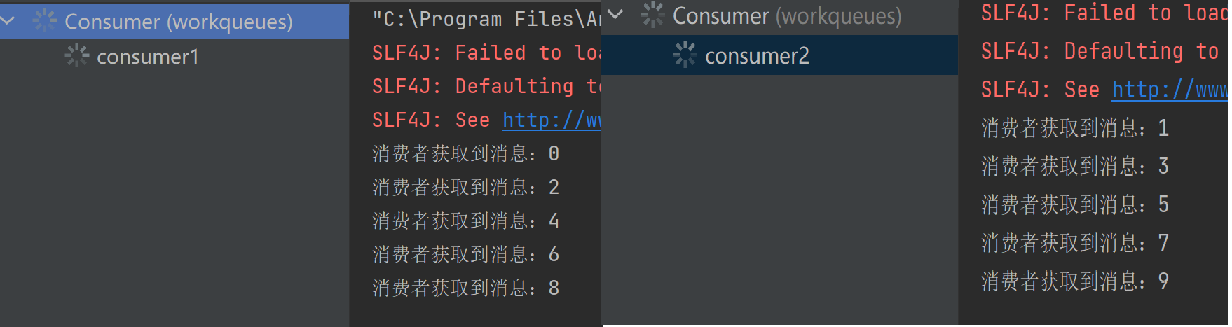 而订阅消费消息,一个消息只能有一个消费者成功的消费,收到消息后需要发送ack,告诉RabbitMQ服务成功的消费了该消息,针对多个消费者订阅一个队列的情况,RabbitMQ默认使用轮询的方式发送给不同的消费者