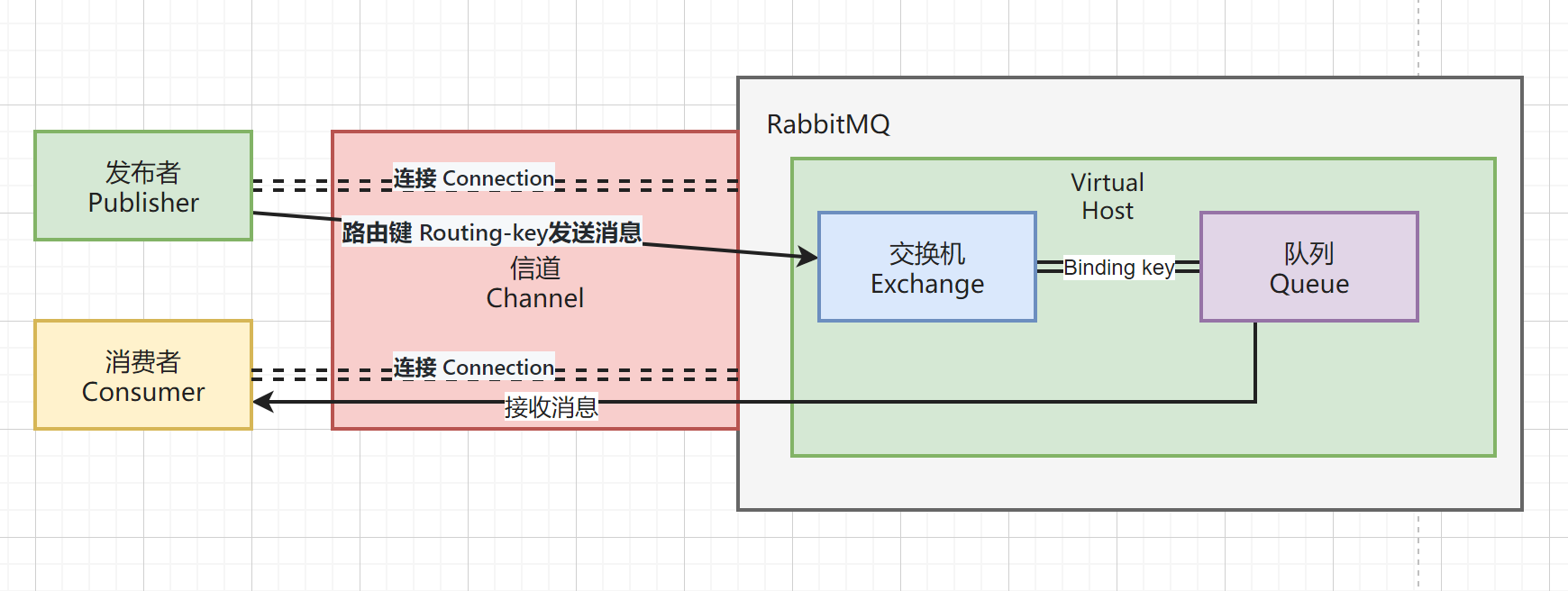 我们主要关注RabbitMQ如何发送消息和订阅消费消息,首先RabbitMQ服务中交换机和队列通过Routing-key进行关联,再由发布者与RabbitMQ服务通过Channel建立连接后,通过Routing-key发送消息到交换机,最后由交换机对消息进行路由匹配到相应队列后,由队列进行分发