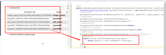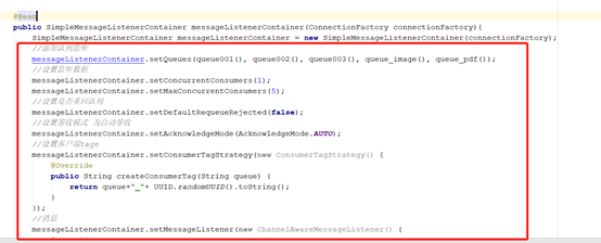 | @Bean public SimpleMessageListenerContainer messageListenerContainer(ConnectionFactory connectionFactory){ SimpleMessageListenerContainer messageListenerContainer = new SimpleMessageListenerContainer(connectionFactory); //添加队列监听 messageListenerContainer.setQueues(queue001(), queue002(), queue003(), queue_image(), queue_pdf()); //设置监听数据 messageListenerContainer.setConcurrentConsumers(1); messageListenerContainer.setMaxConcurrentConsumers(5); //设置是否重回队列 messageListenerContainer.setDefaultRequeueRejected(false); //设置签收模式 为自动签收 messageListenerContainer.setAcknowledgeMode(AcknowledgeMode.AUTO); //设置客户端tage messageListenerContainer.setConsumerTagStrategy(new ConsumerTagStrategy() { @Override public String createConsumerTag(String queue) { return queue+"_"+ UUID.randomUUID().toString(); } }); //消息 messageListenerContainer.setMessageListener(new ChannelAwareMessageListener() { @Override public void onMessage(Message message, Channel channel) throws Exception { String msg = new String (message.getBody(),"UTF-8"); System.out.println("---------->>消息为:"+msg); } }); return messageListenerContainer;