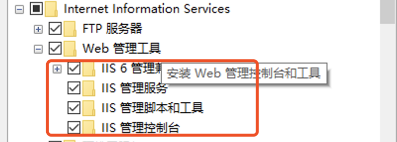第一步、在启动获关闭Windows功能中找到“Web管理工具”,并把“Web管理工具”里面的所有项都勾选上;