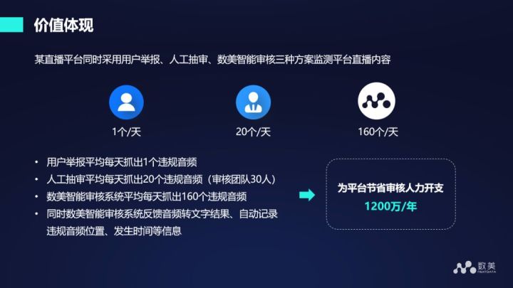 下面是我们真实的一个价值体现,某直播平台同时采用用户举报、人工抽审、数美智能审核三种方案监测平台直播内容。用户举报平均每天抓出1个违规音频,人工抽审平均每天抓出20个违规音频(审核团队30人),数美智能审核系统平均每天抓出160个违规音频,同时数美智能审核系统反馈音频转文字结果、自动记录违规音频位置、发生时间等信息。